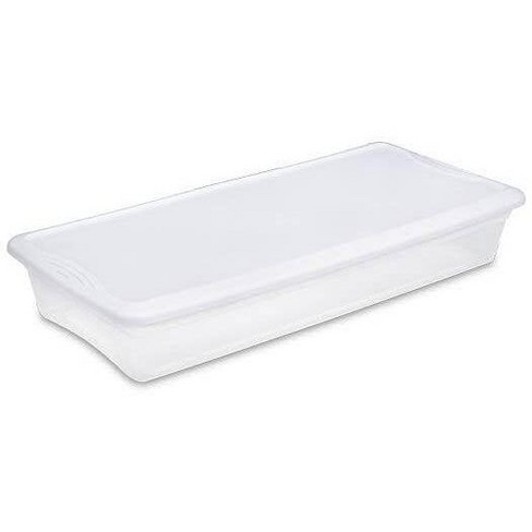 H inches 41 qt lidded under bed storage box with recessed handles for easy carrying features a see through base allowing contents to be easily identified indexed lid allows for stacking in closets garages or utility rooms.