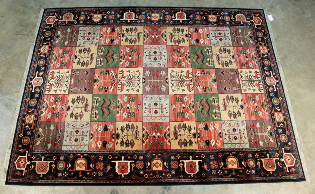 The design seen here is taken from the bakhtiyari tribes of ancient persia exhibiting motifs of trees flowers and repeated medallions in hues of greens reds blues and beiges.